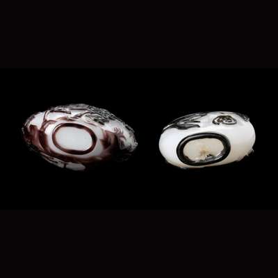 清 涅白地套紫料仙人騎鹿 及 涅白地套黑料蝙蝠三多圖鼻煙壺(共兩件)