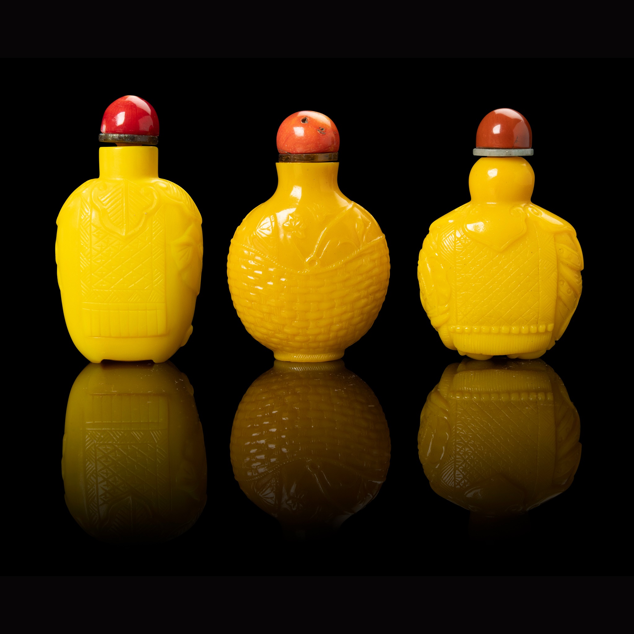 清 黃料象形及藤編花籃紋鼻煙壺(共三件)