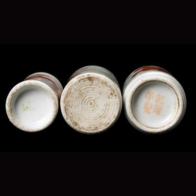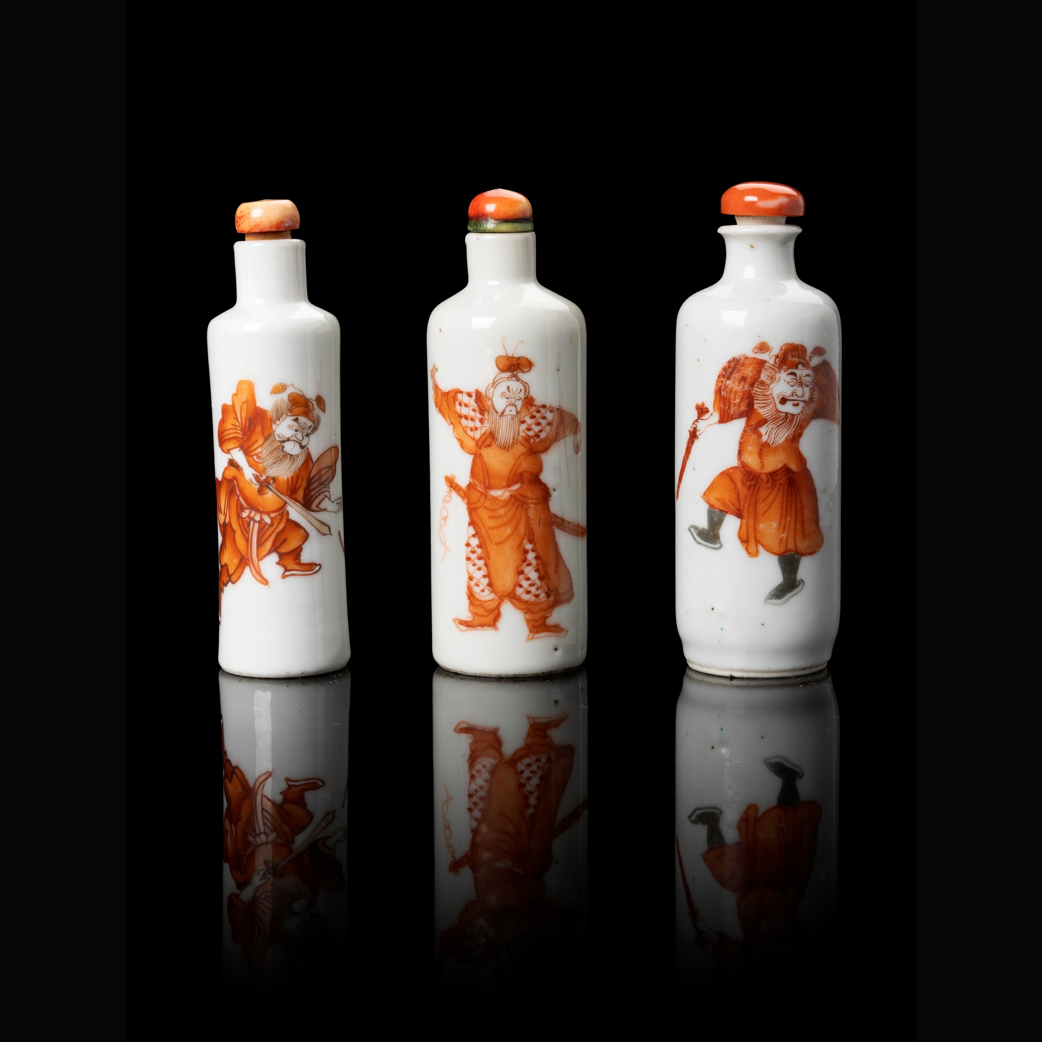 GROUP OF THREE IRON-RED 'ZHONG KUI' SNUFF BOTTLES