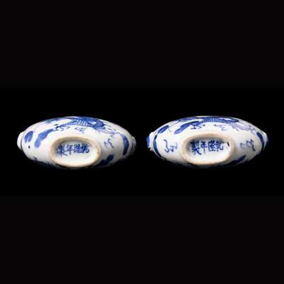 TWO BLUE AND WHITE 'DRAGON' SNUFF BOTTLES