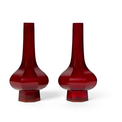 each of octagonal form, supported on a tall foot, the sides rounding to a bulbous pear-shaped body and rising to a slender neck, the central bulb cut with gently curving facets, the glass of an even rich red colour of crushed-raspberry tone