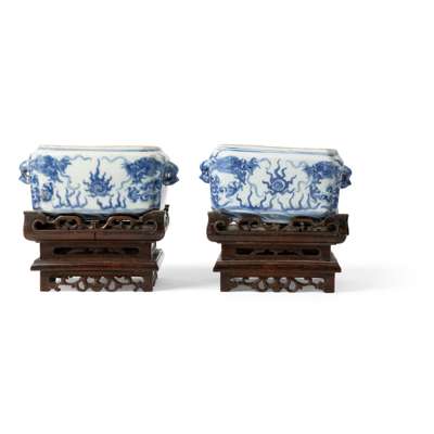 each of near square form with canted corners, the body painted with two dragons chasing flaming pearls, flanked with two pairs of animal heads on either side as handles, the base inscribed with a six-character Daoguang mark in underglaze blue, with converted wooden stands