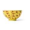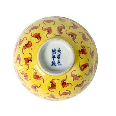 清光緒款及年代 黃地礬紅彩百蝠紋碗
