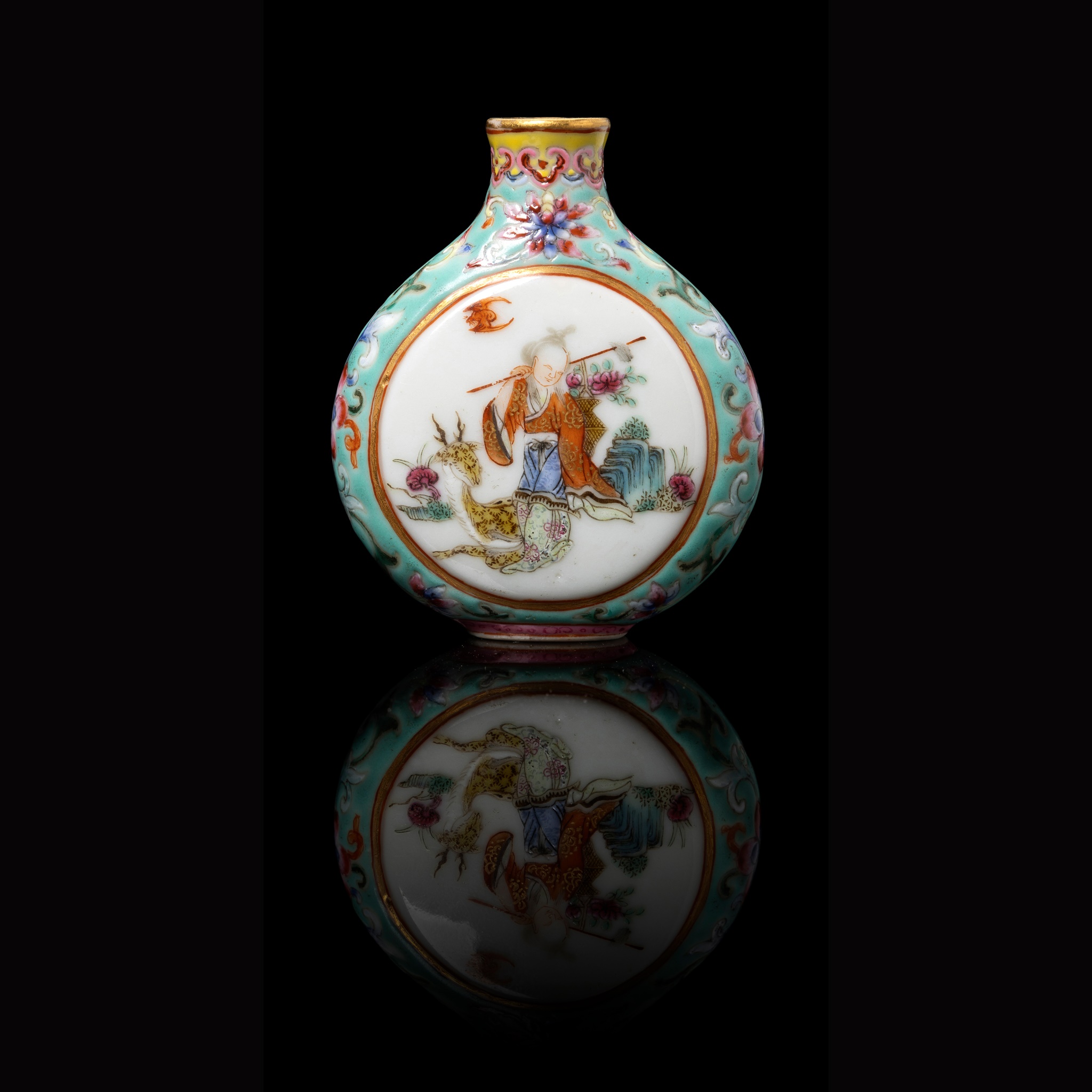 of flattened form, both sides each painted with a figure within roundels reserved on a turquoise ground decorated with scrolling tendrils, the base inscribed with a four-character Daoguang mark in iron red