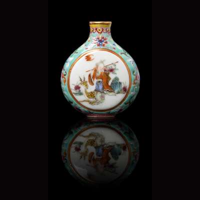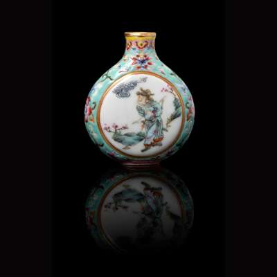 十九至二十世紀 道光款 松石綠地粉彩開光人物紋鼻烟壺