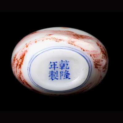 finely painted in red enamel with a continuous scene of small houses in mountainous landscape, one side inscribed with small seals around, all below a band of ruyi-head clouds in blue, the base inscribed with a four-character Qianlong mark in seal script