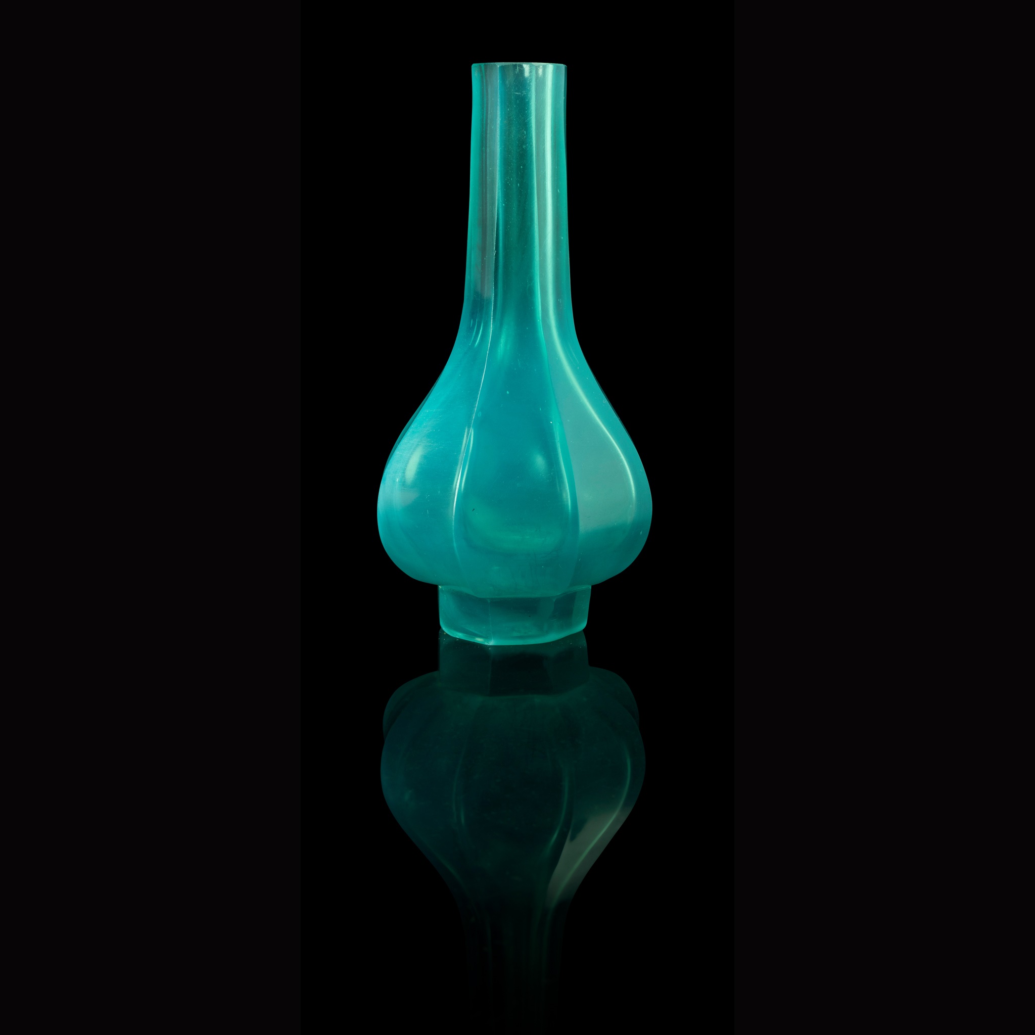 the sightly spreading body built in octagonal section of pear-shaped form, each facet elegantly fluted towards the tall, slender neck, the recessed foot encircled by a wide flat rim, the base wheel-cut with a four-character Qianlong mark within double square