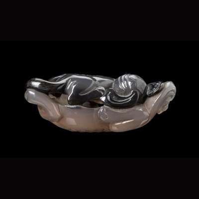 reticulated pendant cleverly using the white and black tones of the agate to form two tigers playing with each other with a brocade ball by their foot