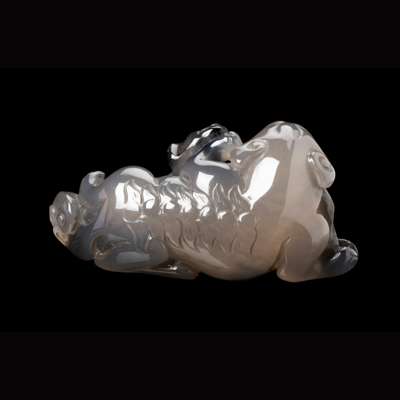 清 冰糖瑪瑙巧雕雙虎戲球吊墜