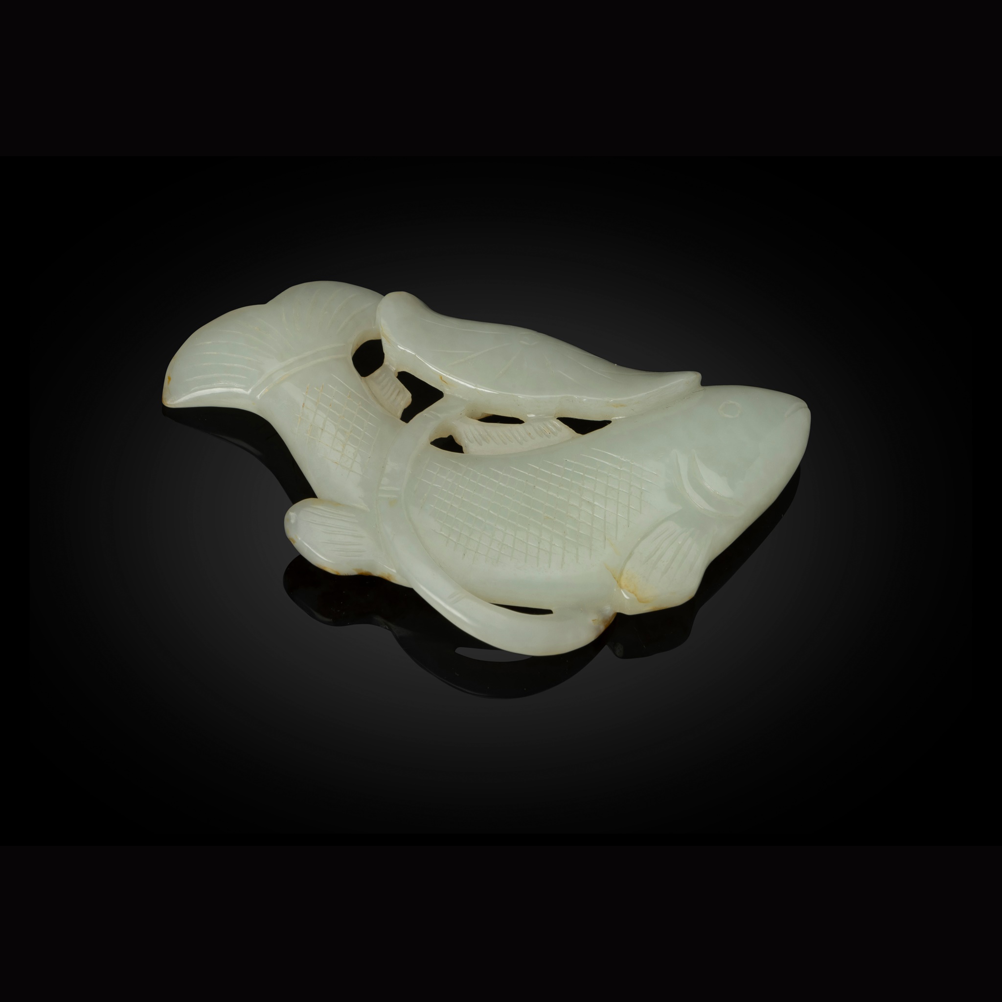 carved in openwork with a large carp jumping out from a lotus pond with a lotus above its body, the stone has an even white colour on one side, and with russet colour on the reverse