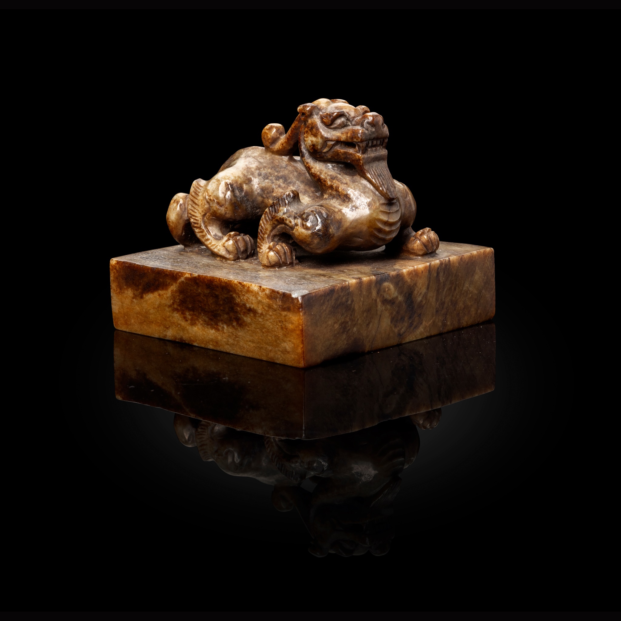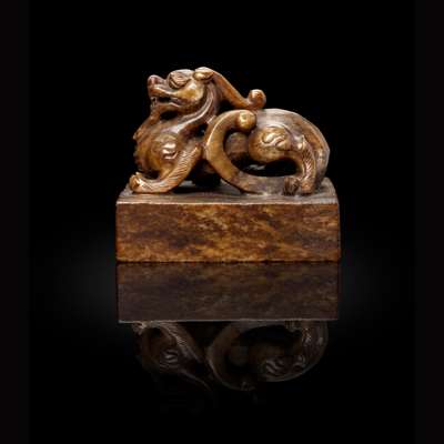 carved with a striding unicorn qilin on a square podium as a knob, the seal carved with a three-character inscription, the stone of dark celadon colour with russet inclusion overall