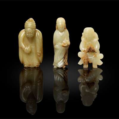 comprising: one celadon jade foreign figure wearing a turban and large cap, the stone of yellowish tone, 8cm high; one pale celadon literati figure holding a ruyi-sceptre in his right hand, the stone with russet inclusion, 8cm high; and one boy deity with celestial ribbon around his body and his hands in meditation mudra, the stone with russet inclusion, 6.3cm high