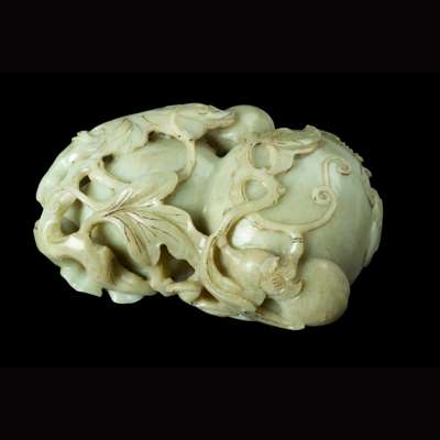 naturalistically carved in the form of a large double-gourd entangled in gnarled branches, issuing large serrated leaves, entwining tendrils and further smaller gourds, the stone of pale celadon colour with white vein inclusions