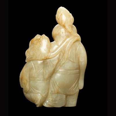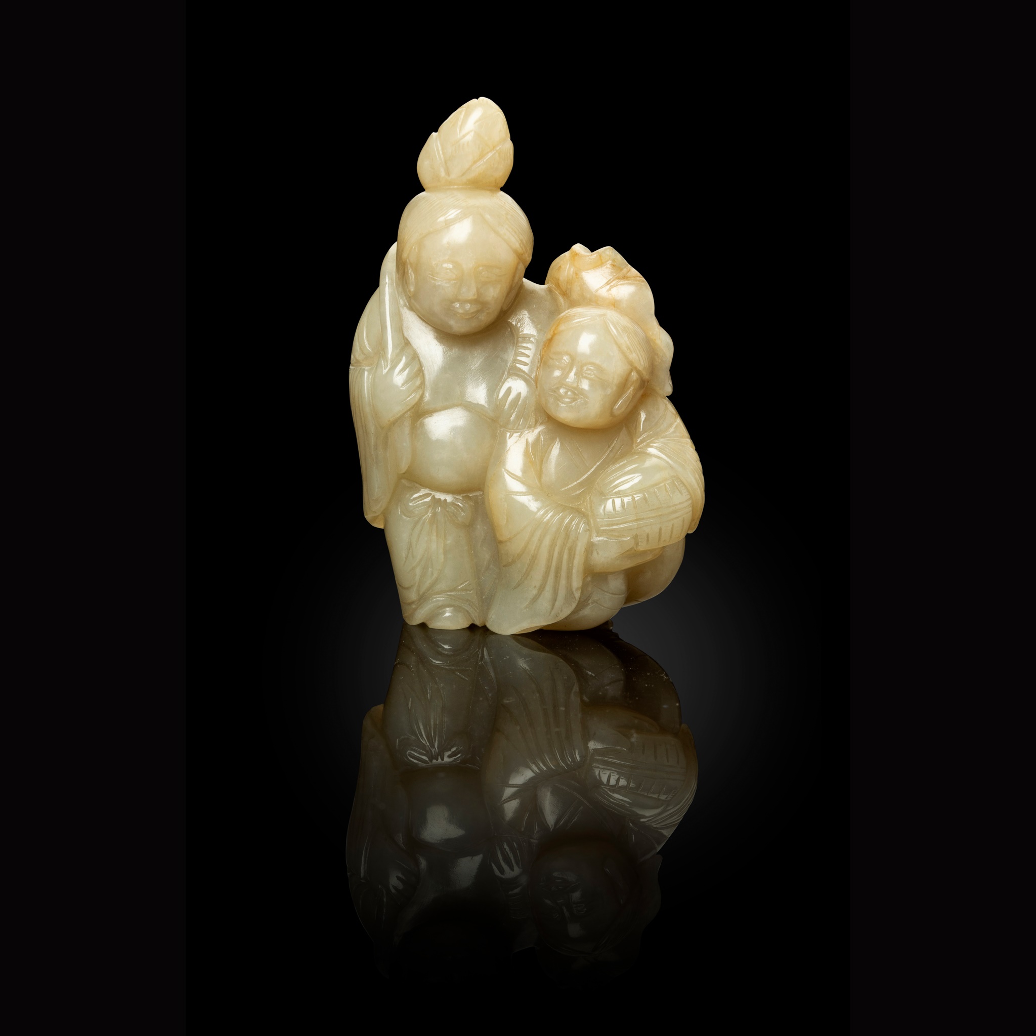 PALE CELADON JADE CARVING OF 'HEHE ERXIAN TWINS' FIGURAL GROUP