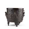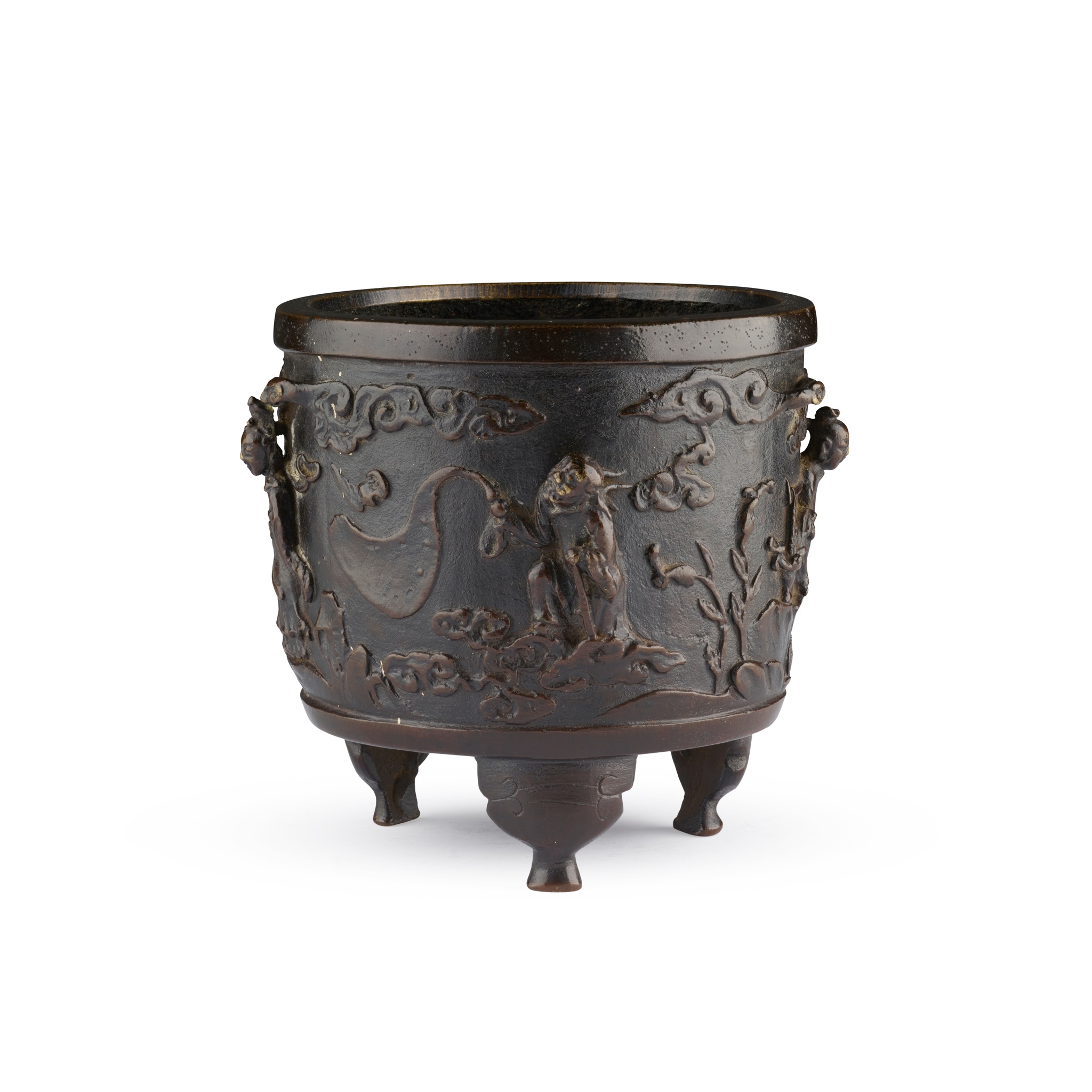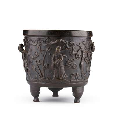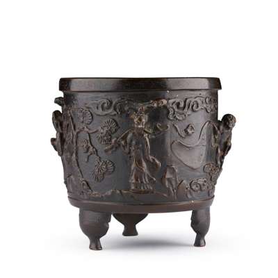of cylindrical form set on three bracket feet, cast in high relief on the recessed body with four immortals each with their attributes separated by pine tree, bamboo, rockwork and flowering branches