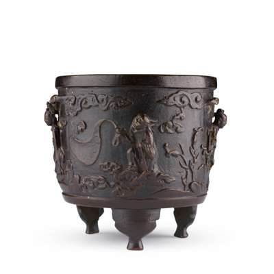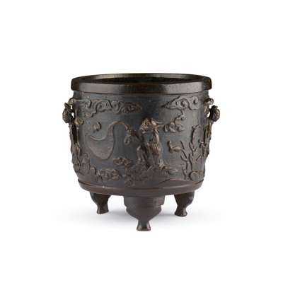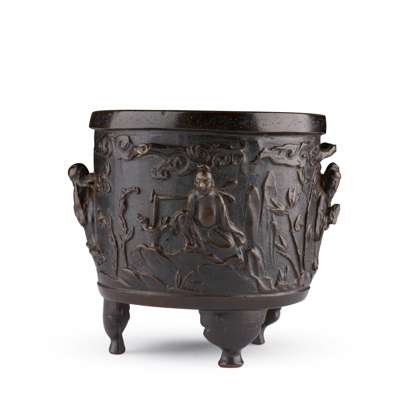 A highly similar bronze tripod 'nine sages' incense burner, dated to the late Ming dynasty, note the comparable form, treatment on the high relief upper body of the figures, design of the feet, and the pinhole decoration around the lipped rim, was previously in the collection of Roger Keverne, sold at Bonhams London, 7 June 2021, lot 549.