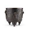 Note: The immortals depicted around the body of the censer, Cao Guojiu, recognised by his twin tablets, or castanets; He Xiangu, holding a stem of lotus flower across her shoulders; Li Tieguai, holding an iron staff and a double-gourd; and Lan Caihe, sitting on rockwork with a basket of flowers, are four of the Eight Immortals.