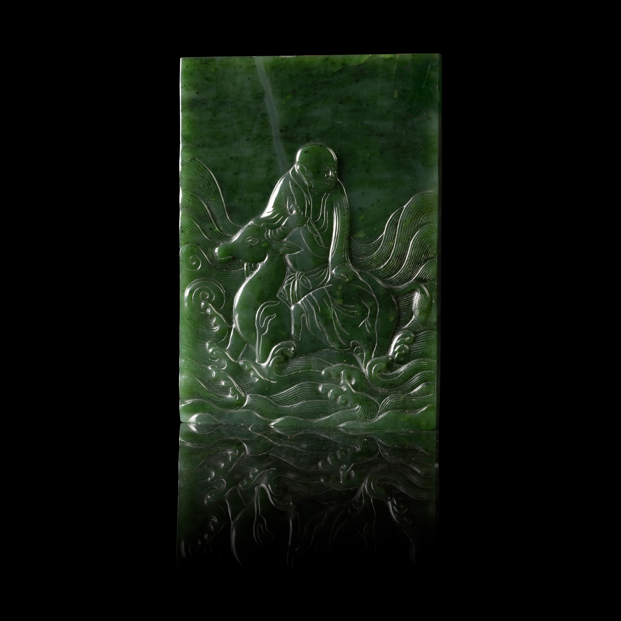 SPINACH-GREEN JADE 'ARHAT ON DEER' TABLE SCREEN
