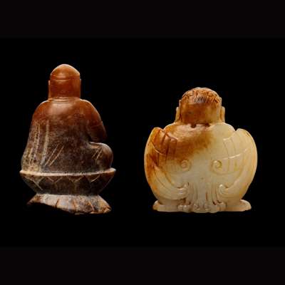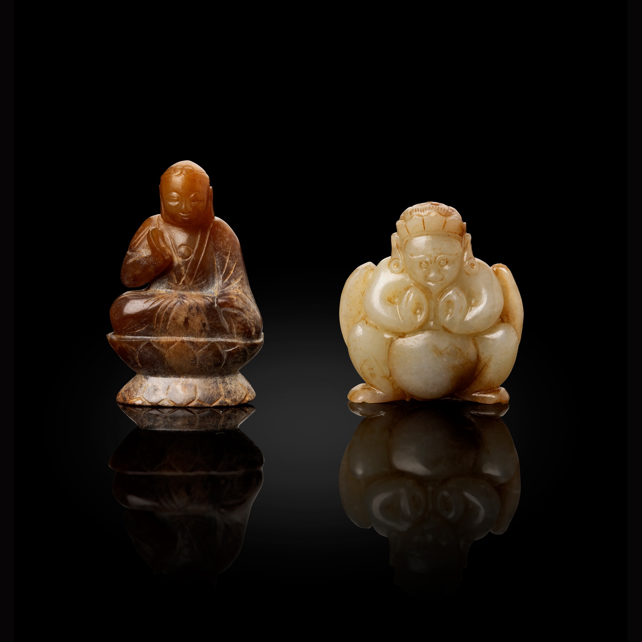 one pale celadon carving of a squatted garuda in double-abhaya mudra, wearing a five-pointed crown and with its large wings tucked behind, the stone of pale celadon colour with russet inclusions; one Buddha seated on a double-lotus throne with his right hand half-raised, the stone has a brownish-celadon hue with white calcification