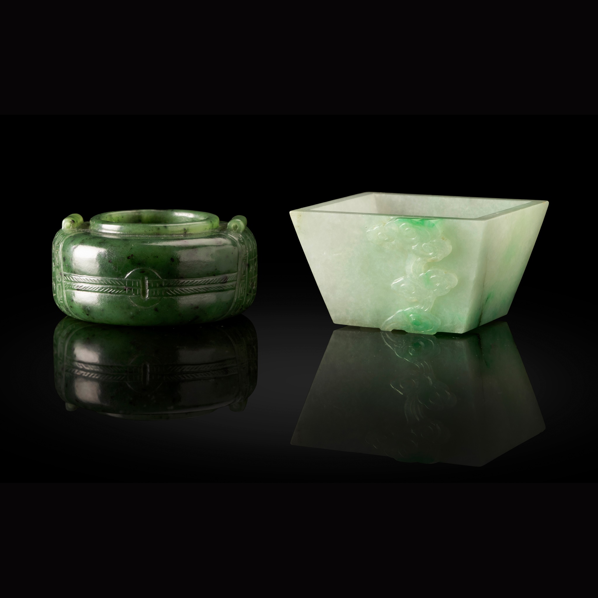one of spinach jade, carved in the form of a squatted circular vase with coins and cloth wrapped on either side, flanked by two tubular handles on the shoulder, the stone of dark green colour with black dot inclusions; the other jadeite water dropper carved in the form of a tapering rectangular vessel supported on short foot, one side carved in relief with a branch of lingzhi fungus, the stone of translucent white colour with bright green highlight