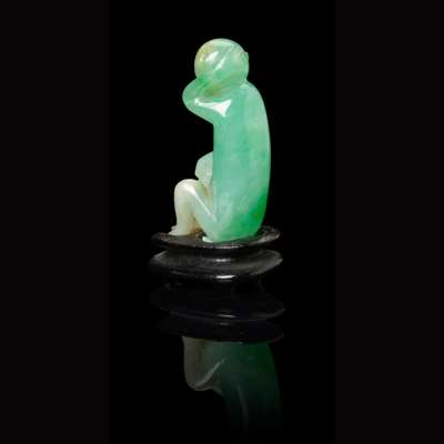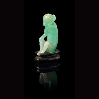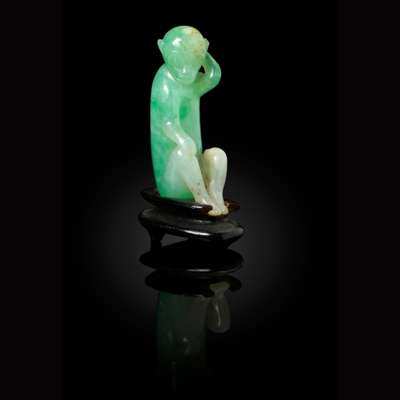 realistically carved as a crouching monkey, left hand placed behind its head, right palm rested on right knee, on a fitted wooden stand