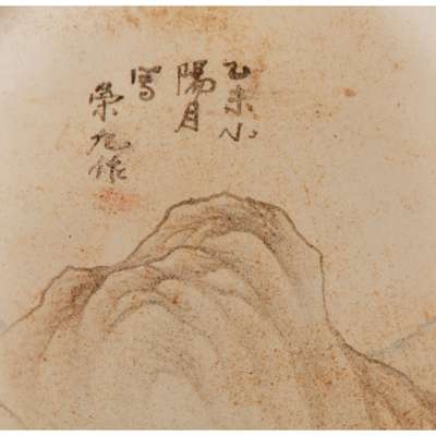 flattened rectangular form with sloppy shoulders, painted with landscape on both sides, dated to the year of Yi Wei, corresponding to 1895AD, signed