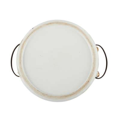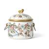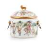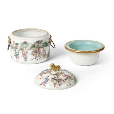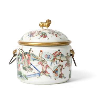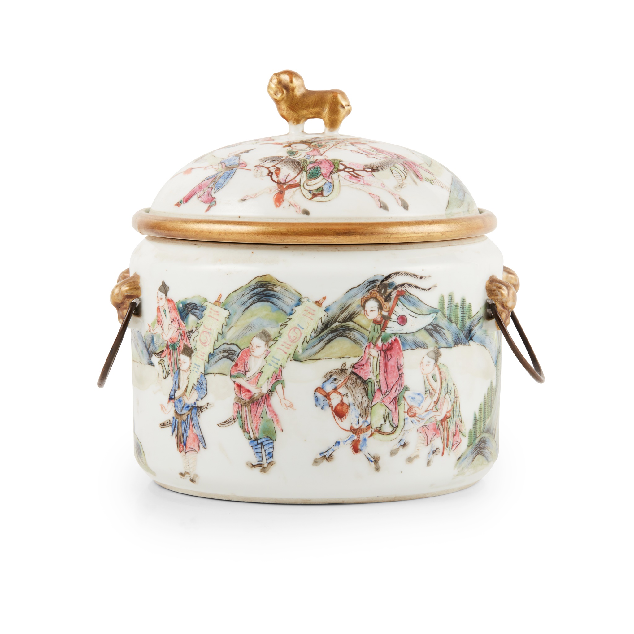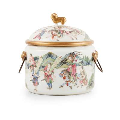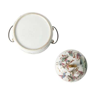 painted on the cylindrical body with figures in fight, the dome cover similarly decorated and surmounted with a gilded animal finial, the sides further moulded with two pairs of animal mask loop handles holding metal wires, the interior with a deep bowl enamelled with turquoise