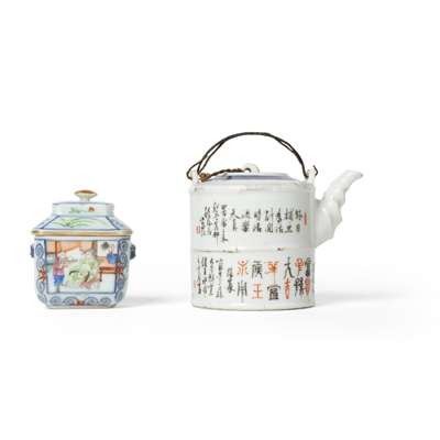 comprising: one teapot of cylindrical form, the centre with a raised groove to imitate bamboo section, set with a grooved spout in imitation of bamboo shoot, painted with figures to one side, reverse inscribed, the base marked in iron-red but covered by a red wax seal; and one rectangular lidded tea caddy with canted corners, painted on both sides with figures