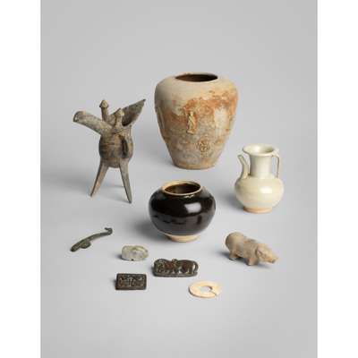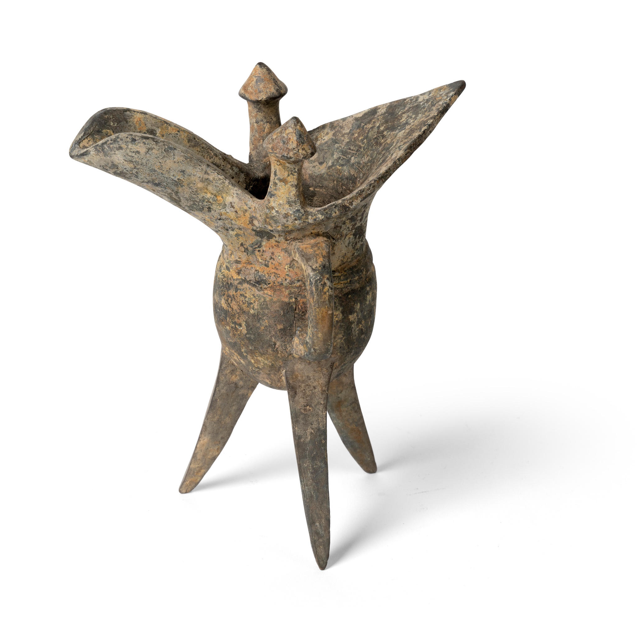 Compared to zun and gu vessels dated to the Shang dynasty made in the form of ceramic instead of bronze, fewer jue and jia vessels are known. Compare to a greatly simplified and squatted jue, dated to the late Shang dynasty, in the Asian Art Museum, San Francisco, object no. B60P1834, and illustrated by He Li in Chinese Ceramics - The New Standard Guide, London: Thames and Hudson, 1996, p. 63, no. 20. Also see other similar simplified examples, Shang dynasty, one in Princeton University Art Museum, museum no. y1965-52; some in Institute of History and Philology, Academia Sinica Taipei, accession nos. R023599BBWA_2, R000175CCWA, R000174CCWK_1. These tripod vessels with slender legs, like this lot, would have been more difficult to fire successfully.