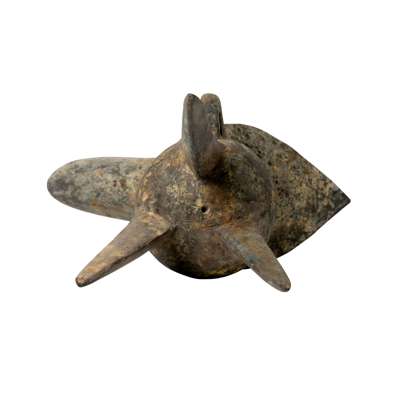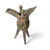 Note: Ritual wine vessels in the form of a jue are more commonly seen in bronze. They were designated for heating and pouring wine during Shang dynasty rituals. The capped posts rising from the rim would have allowed the hot metal vessel to be lifted from the heat and poured, whereas the ceramic form of this vessel would not have been suitable for this.