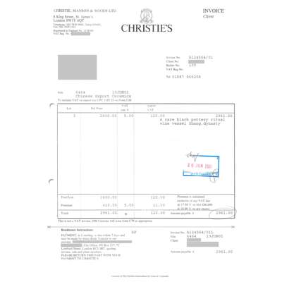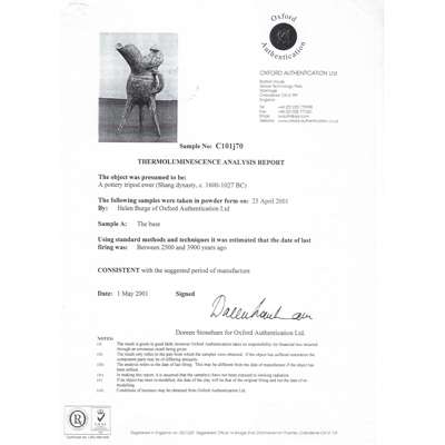 The result of the Oxford Authentication Ltd. thermoluminescence analysis test, sample no. C101j70, is consistent with the dating of this lot, with a photocopied certificate dated 1 May 2001.