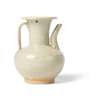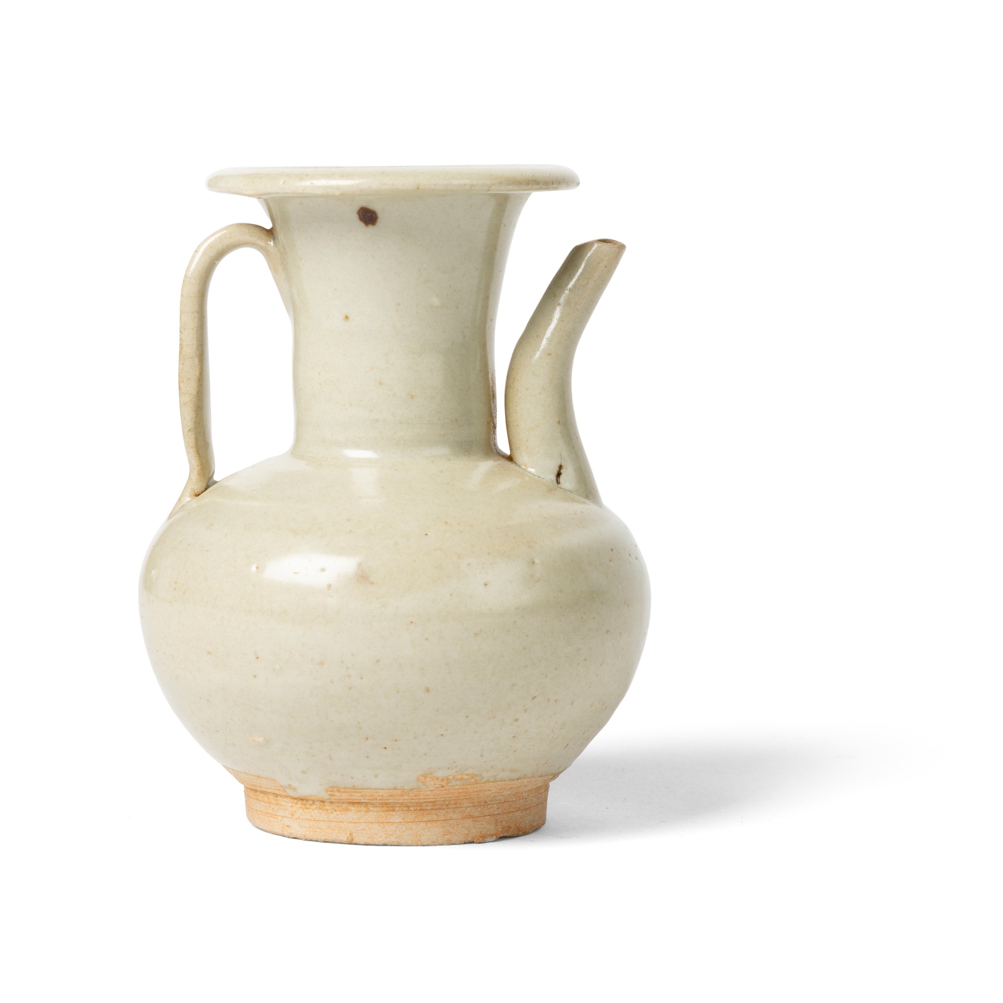 raised on a ring foot to a globular body and a trumpet-form mouth, one side of the shoulder set with a curved spout and the reserve with a loop handle, covered in light celadon glaze stopped neatly above the foot revealing greyish buff body with brown hue