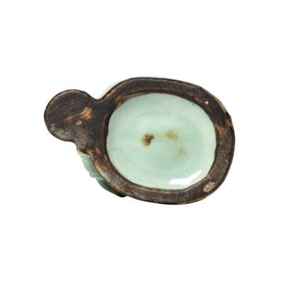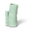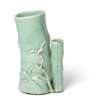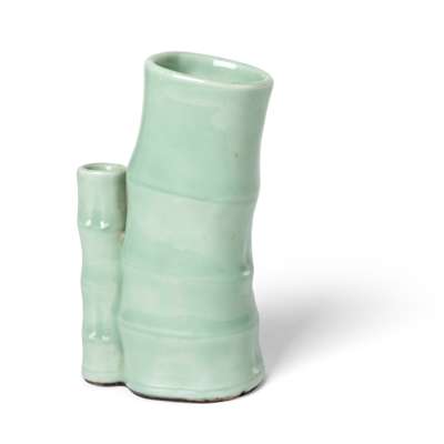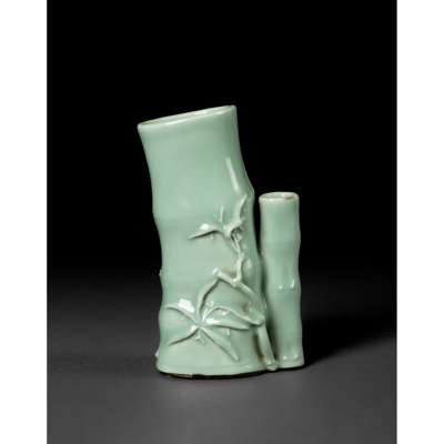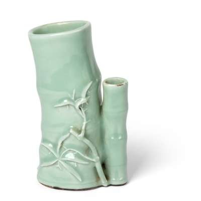 naturalistically modelled as a hollowed section of bamboo with a smaller section to the side, further moulded in high relief with leafy shoots curling up and around the front face of the vessel, covered overall in a light celadon glaze, leaving only the foot ring unglazed and covered in brown paint