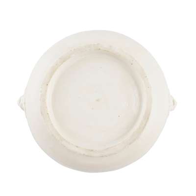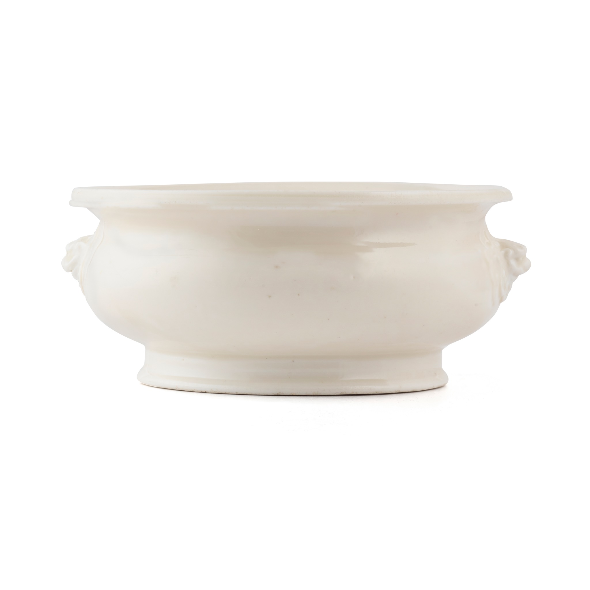 of compressed globular form, rising from a spreading foot to a flared rim, the shoulders set with a pair of lion mask handles, the exterior and part of the interior covered in a creamy colour glaze with ivory tinge