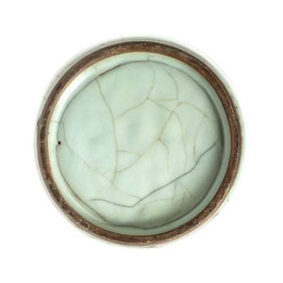 potted with a slightly tapered cylindrical body rising to a tubular neck and flat flaring mouth, covered overall with a thick greyish blue glaze suffused with a network of black and russet crackles, the base similarly glazed and foot rim applied with a dark-brown dressing