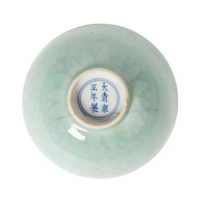 finely potted with rounded sides supported on a slightly tapered foot, elegantly decorated on the exterior with flowers borne on foliated scrolling tendrils above an overlapping band of petals on foot, the interior carved with a flower as central medallion, delicately glazed in opaque, luminous, and jade-like celadon glaze, the base inscribed with a six-character Yongzheng mark within a double-circle