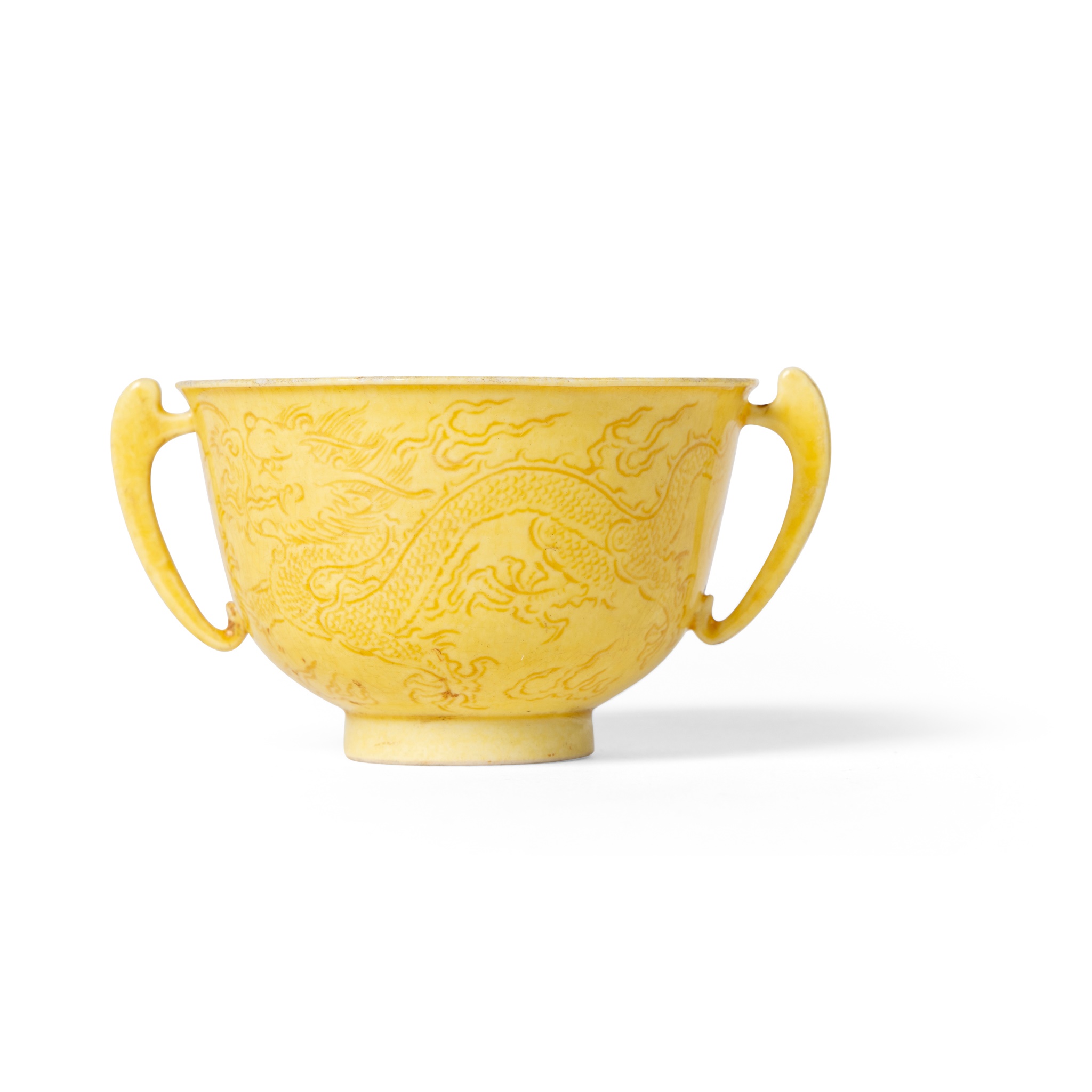 INCISED YELLOW-GLAZED 'DRAGON' HANDLED CUP