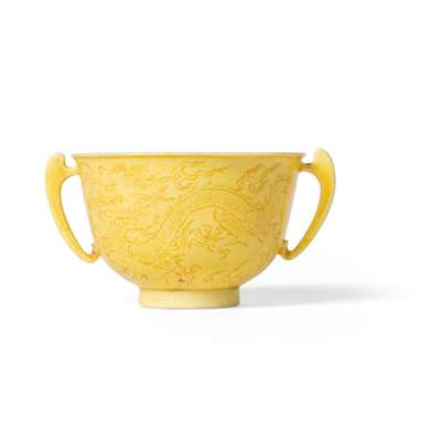 十九至二十世紀 康熙款 黃釉暗刻龍紋雙耳杯