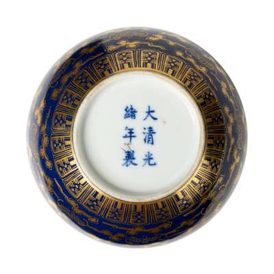 densely painted in gilt with bats in flight amongst ruyi-head clouds all over between a ruyi band on the mouth rim and a lappet band on foot, all against a navy blue ground, the base inscribed with a six-character Guangxu mark in underglaze blue