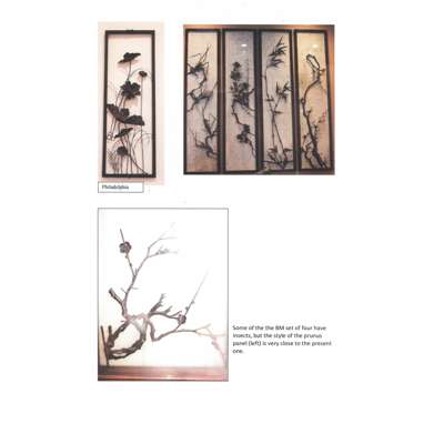 depicting flowering plum blossoms with larger branches issuing from the right margin, wooden frame