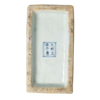 Note: A closely related box and cover from the Mrs B. Z. Seligman collection, and now in the British Museum, is illustrated in Jessica Harrison-Hall, Ming Ceramics in the British Museum, London: British Museum, 2001, pl. 8.5, together with a similarly decorated Zhengde mark and period ink slab with cover similarly decorated, pl. 8.6; Also see an example sold at Sotheby's London, 14 May 2014, lot 208.