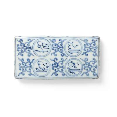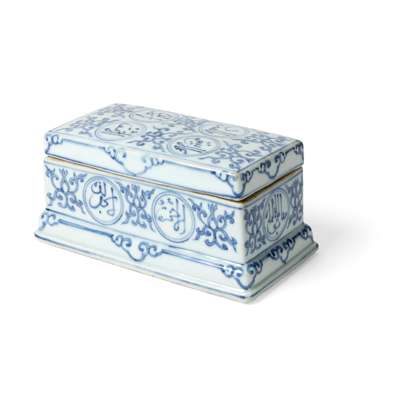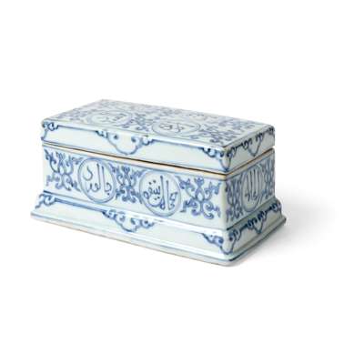 或為明代 正德款 青花伊斯蘭文番蓮紋長方蓋盒