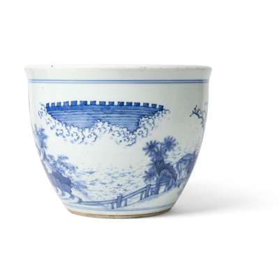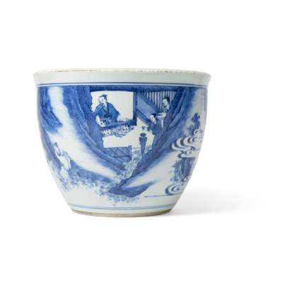 potted with steep slightly rounded sides, painted with a courtly figure just dismounted from his horse, led by a boy assistant towards a grotto, inside a noble hermit playing the qin musical instrument, an assistant attending to a tripod incense burner