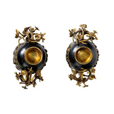 Note: Sawasa is the Japanese term given to describe a distinctive style of metalwork produced in Asia during the 17th and 18th centuries. The Asian artists and craftsmen adopted European models and combined them with Chinese and Japanese materials and decorative motifs of gilt reliefs and engravings on a lustrous lacquered surface. The final objects were finished in black and gold, the black was often achieved through controlled patination but sometimes through lacquering, and the gold was usually applied by means of mercury gilding.