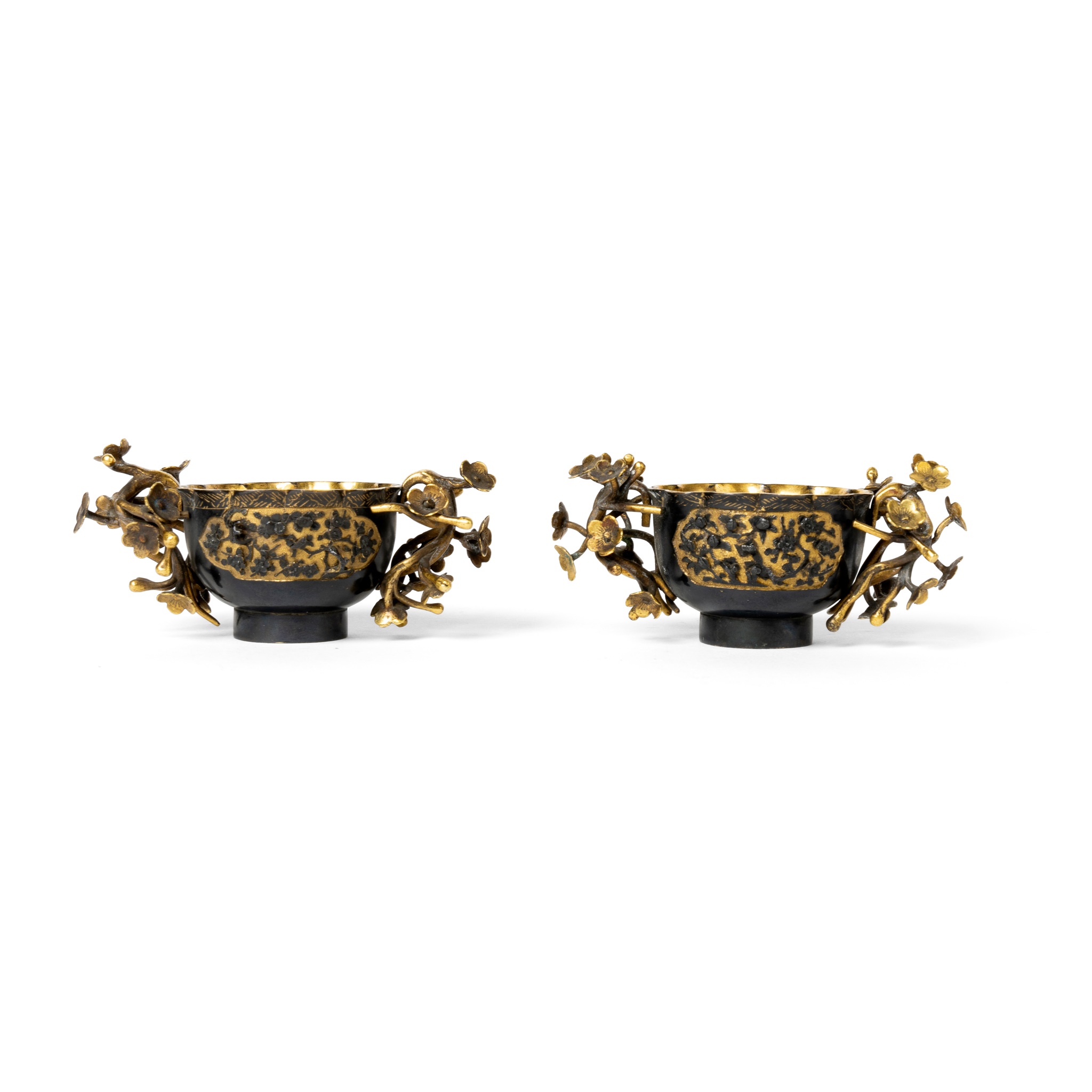 中國或日本 十八世紀 局部鎏金銅梅花紋花口杯(一對)