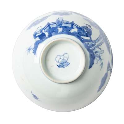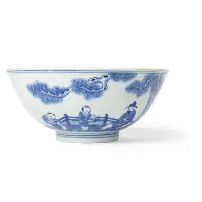 painted on one side of the bowl with a nobleman holding a wine cup, a boy assistant carrying a vessel containing a wine cup walking towards him, all underneath a canopy of pine tree, reverse with a bat in flight, the base painted with a floral motif