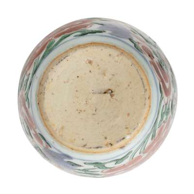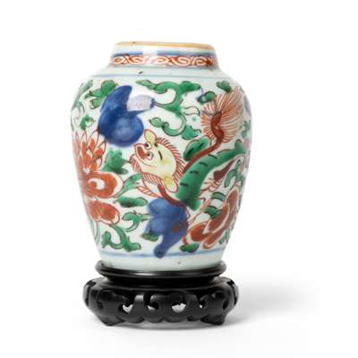 Note: Compare to a larger (19.4cm high) wucai jar, Ming dynasty 16th-17th century, similarly painted with Buddhist lions and flowers, sold at Christie's London, 19 Jul 2018, lot 212.