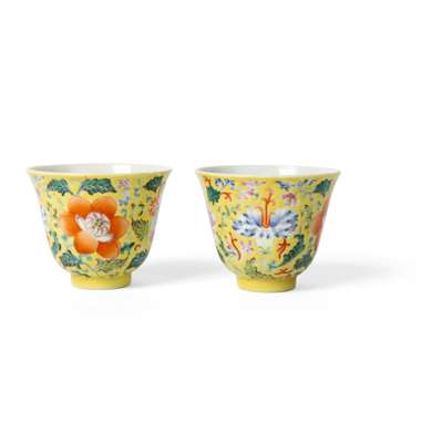 PAIR OF YELLOW-GROUND FAMILLE ROSE 'FLOWER' CUPS