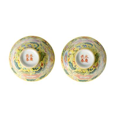 each of reversed bell shape supported on short foot, the exterior painted with four large flower heads against yellow-enamelled ground, the base inscribed with a four-character mark reading 'yong qing chang chun (eternal joy and everlasting spring)' in iron red