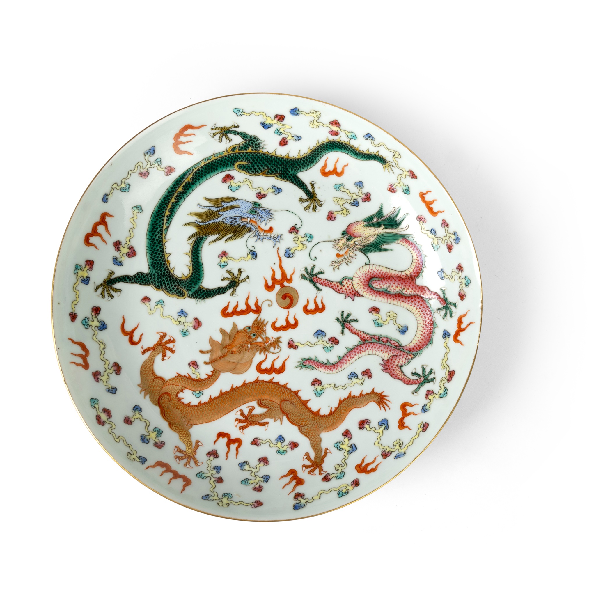 painted with gilded iron-red, green and pink dragons in flight chasing a flaming pearl in the centre amongst ruyi-head clouds and flames, the base inscribed with a six-character Guangxu mark in iron-red